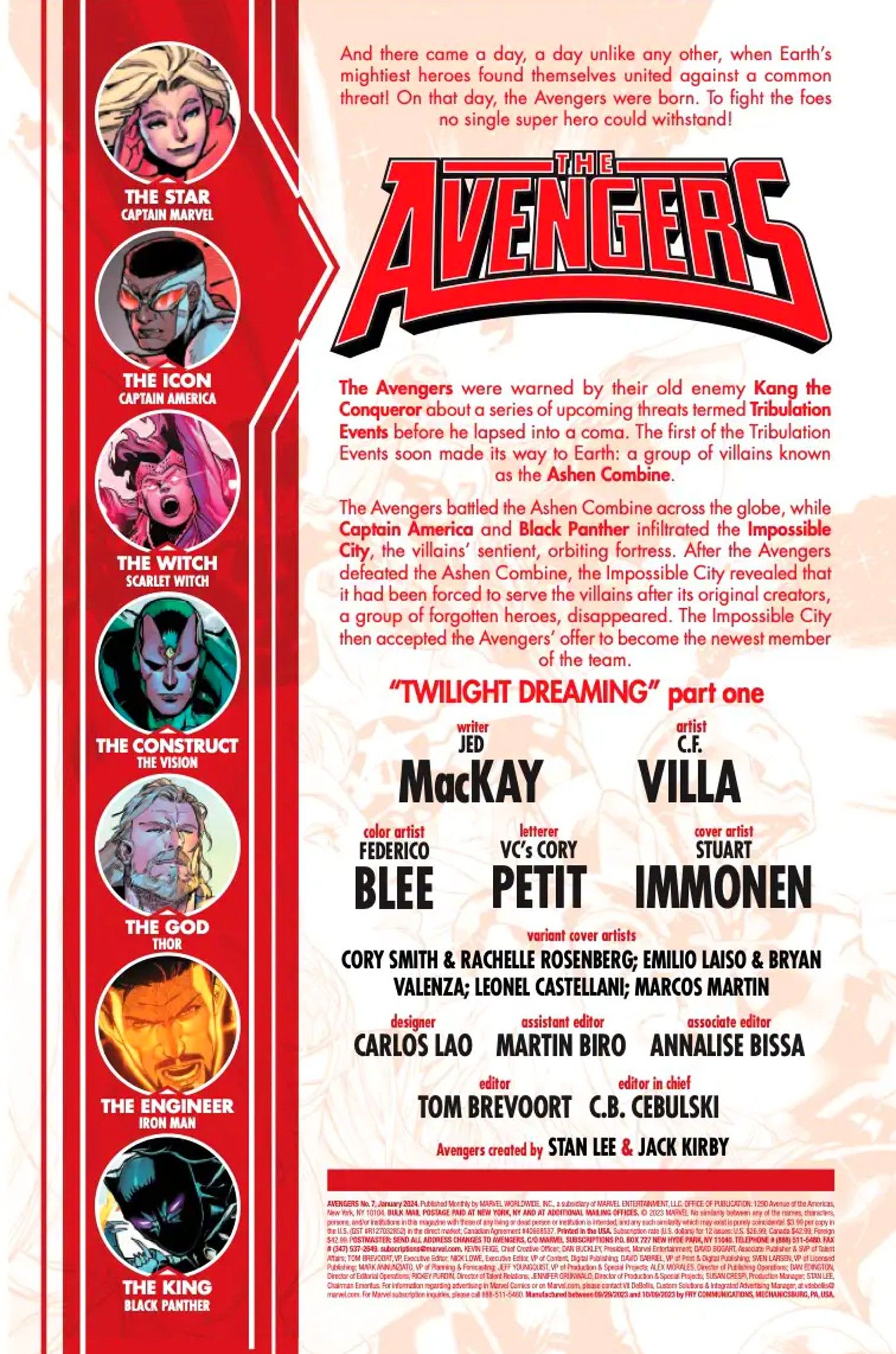 En el volumen actual de Vengadores, el equipo se enfrenta a Eventos de Tribulación (catástrofes importantes que les exigen asumir roles arquetípicos específicos), por ejemplo, Iron Man como “el Ingeniero” y Vision como “el Constructo”. Kang el Conquistador ha puesto al equipo en este camino como parte de su conflicto con el misterioso Myrddin, cada uno de los cuales intenta desbloquear una sección prohibida del tiempo conocida como el “Momento perdido”. En el último número, los Vengadores lucharon contra un grupo multiversal de asesinos conocido como Ashen Combine, mostrando lo mucho que está en juego que traen consigo los Eventos de Tribulación. Ahora, en el número 7, los fanáticos ven al equipo enfrentando lo que parece ser una invasión a gran escala de otro mundo.