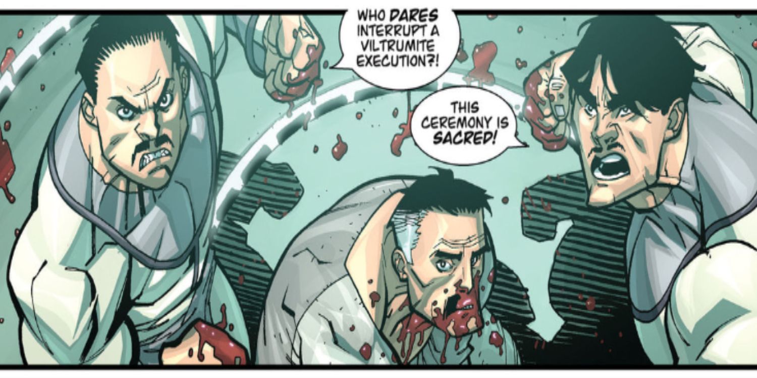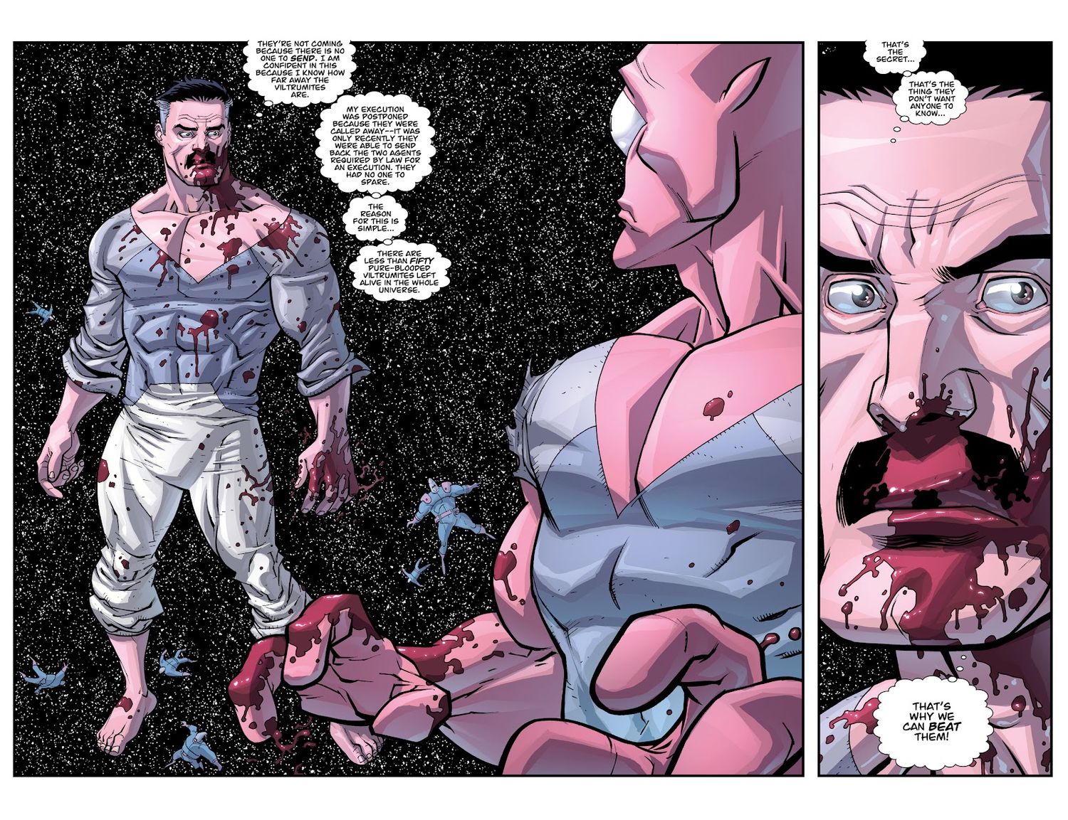 Es después de su fuga y de una muerte en equipo verdaderamente horrible, con la sangre de los verdugos de Viltrumite en sus manos, que Omni-Man deja caer una gran revelación sobre Allen. Hasta este punto en Invencible, los viltrumitas habían sido presentados como una potencia imperial floreciente; Si bien su control interestelar se extiende a lo largo y ancho, con muchas de las otras razas de la galaxia bajo su control, la verdad de sus motivaciones es mucho más urgente. Como explica Omni-Man, “Quedan menos de cincuenta viltrumitas de sangre pura vivos en todo el universo.,” cambiando drásticamente su posición de una de poder a una de vulnerabilidad.