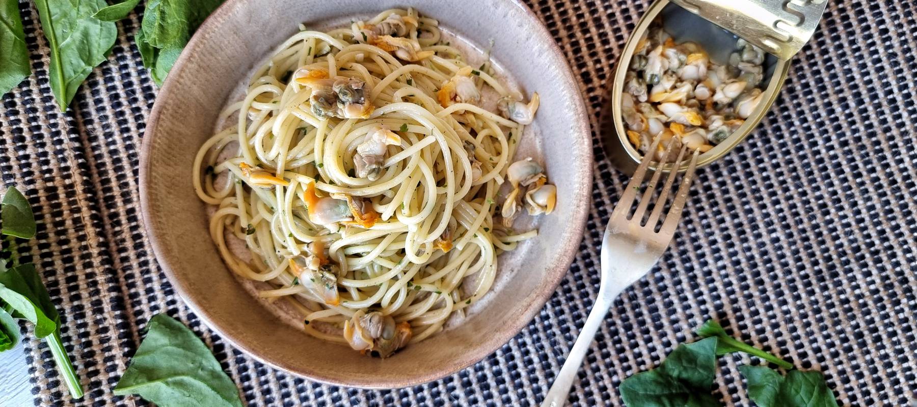 Se usan espaguetis secos y no pasta fresca, ni otros formatos cortos: en Italia se mira mucho más de lo que pensamos qué pasta se utiliza para cada cosa y con qué salsa. Personalmente, os recomiendo los de Garofalo -que se encuentran más fácilmente en supermercados-, los spaghettone de Benedetto Cavalieri y los de Afeltra. La receta de hoy nace de estos espaguetis, pero en versión rápida y sencillísima: utilizando una lata de buenos berberechos. Cuanto mejor sea la lata, mejor será el resultado y, sobre todo, nos garantizará que no haya arenillas peligrosas que luego resultan tremendamente desagradables a la hora de comer. Mis favoritos últimamente han sido los de Nosa Batea, los de Riviere y los de los Peperetes.