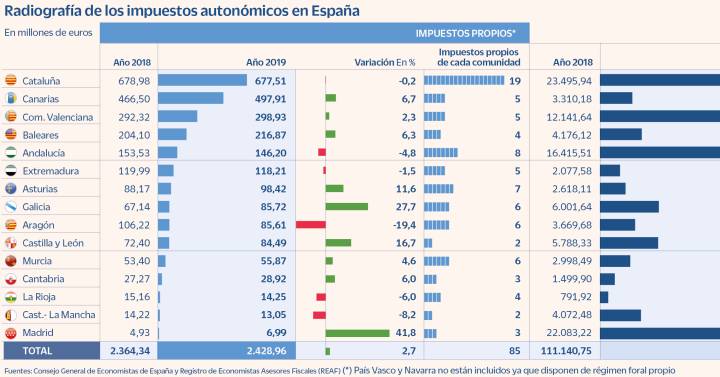 Las comunidades autónomas españolas componen un variopinto mosaico de impuestos propios, formado por un total de 85 tributos repartidos de forma desigual entre las regiones, que recauda casi 2.500 millones de euros cada ejercicio, según los datos recopilados anualmente por el Consejo General de Economistas (CGE) y el Registro de Economistas Asesores Fiscales (REAF). La conclusión que arrojan las últimas cifras disponibles, relativas al año 2019, muestra por lo tanto que la gran batería de impuestos autonómicos redunda en una recaudación inusualmente nimia, con una media de apenas 30 millones de euros por tributo. Dicho de otro modo, estas figuras suponen únicamente el 2,1% del total de los ingresos tributarios de las comunidades autónomas, unos 114.000 millones.