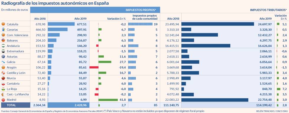 Canarias, por ejemplo, con solo cinco impuestos autonómicos, recauda más de 466 millones de euros –la segunda autonomía con mayores beneficios por detrás de Cataluña–, si bien hay que tener en cuenta que las cifras están distorsionadas con respecto al resto de autonomías debido a la clasificación como tributos propios del impuesto especial sobre combustibles derivados del petróleo y del impuesto sobre las labores del tabaco. “Estos tributos, en el resto del territorio nacional del régimen común, se circunscriben en el ámbito de los impuestos especiales estatales cedidos parcialmente a las autonomías”, recuerdan desde el CGE y el REAF.