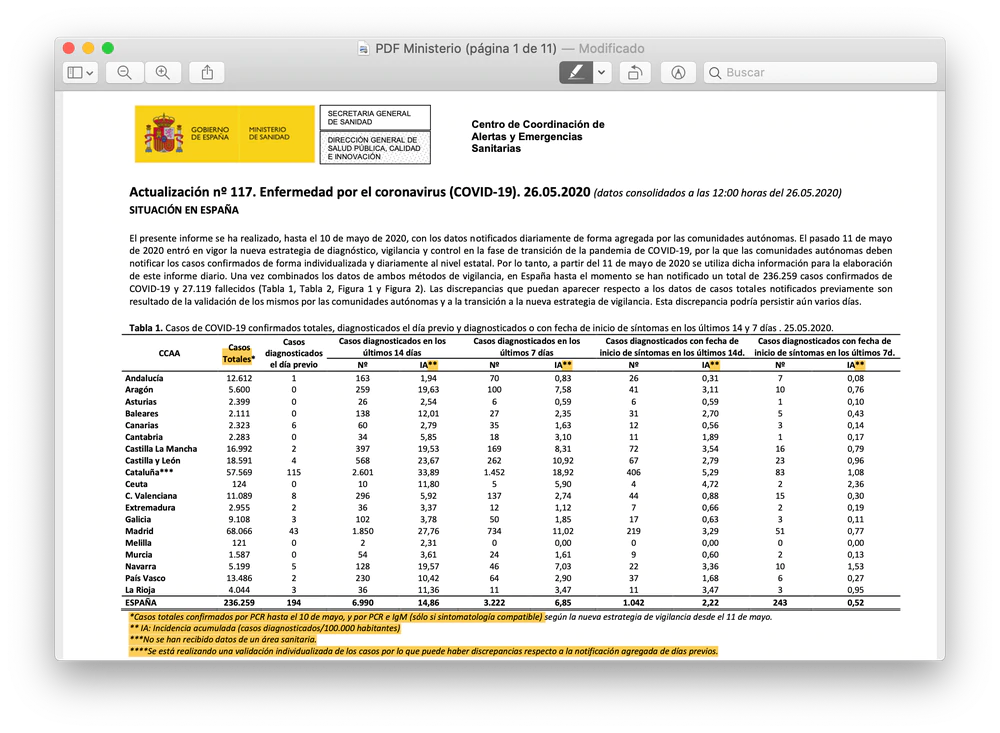 1. Las cifras del día son una foto incompleta. El centro de su comunicación es una foto fija diaria en formato PDF, un documento de texto con los datos de infectados, hospitalizados o fallecidos. Pero seguir el ritmo del virus exige series temporales, para ver su evolución, que no pueden reconstruirse a partir de las cifras estáticas del día (el PDF) que se comentan en las ruedas de prensa. Al menos por dos motivos: porque las cifras de días anteriores cambian continuamente (el dato de hoy miércoles se cambiará quizás mañana y nunca lo sabremos mirando solo los PDF), y porque la información recogida en esos PDF ha ido cambiando.