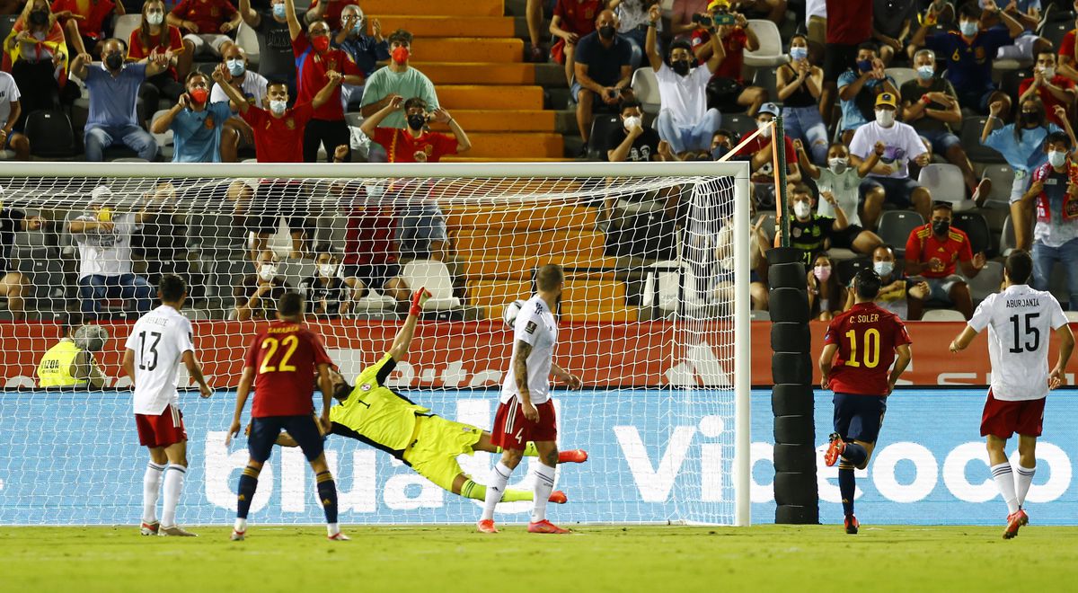 Cinco minutos largos tardó en pasar del centro del campo. No hubo más partido que el que quiso jugar España. Laporte y Eric García, que salieron malparados de Solna, marcaron la raya. Rodrigo jugó fácil en los pases de seguridad y tuvo el pie fino en los cambios de orientación y en los que rompieron líneas. A partir de ahí, España encontró los agujeros por los costados. Primero por la izquierda. Entre Sarabia, Gayá y Carlos Soler iniciaron el atracón que se dio la Roja. El volante valencianista ha entrado pisando fuerte en su primera convocatoria. Si ante los suecos fue el mejor de los centrocampistas, ante los georgianos fue el primero en descubrir cómo rajar el sistema defensivo. Estuvo delicado en el toque y dañino para descubrir los pasillos. De un córner picudo, nació el primer gol. Gayá se encontró el balón en la frontal del área y lo reventó. El duro disparo se coló tras atravesar un bosque de piernas y tocar en un defensor georgiano. Apenas habían transcurrido 10 minutos y España logró el objetivo de abrir la lata lo antes posible para evitar nervios y urgencias.