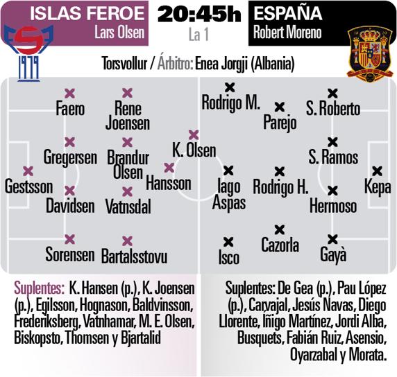 España visita este viernes (20.45 horas) Islas Feroe con el deber no solo de vencer para continuar comandando el grupo F de la fase de clasificación para la Eurocopa 2020, sino de hacerlo desplegando un buen juego que sirva para ganar en confianza de cara al duelo ante Suecia el próximo lunes en el Bernabéu. Ese sí promete ser el duelo en el que la Roja se juegue irse de vacaciones manteniendo su liderato, pero a la vez no está permitido despistarse en el de hoy. Porque el rival es muy inferior a España, pero las circunstancias que envuelven el partido podrían hacer que se complique.