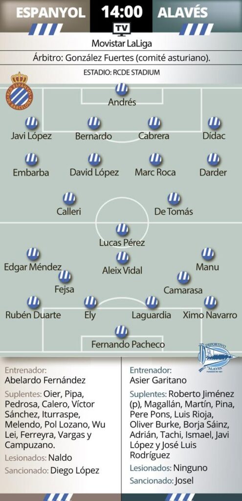 El Alavés, por su parte, visita a un equipo al que no gana desde 2002 cuando se han enfrentado en feudo perico. Y además, Asier Garitano tiene la espina clavada de no haber conseguido vencer nunca a Abelardo en su duelo particular de banquillos. El técnico no hará muchos cambios en el once, aunque afronta el duelo con la importante baja de Joselu, su estilete arriba que está sancionado.