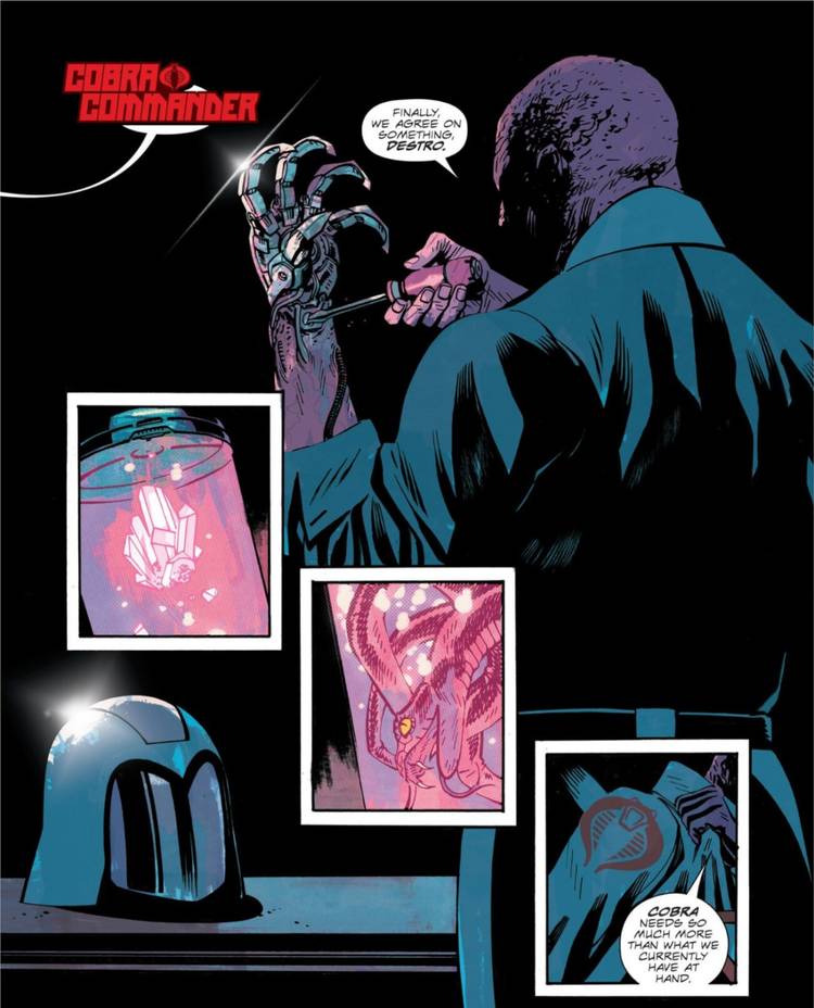 La página que presenta Cobra Commander en soldado joe El número 1 presenta tanto su mano cibernética como la serpiente mutante de Cobra-La, aparentemente insinuando que ambos lados de la personalidad del Comandante jugarán un papel muy importante en las historias venideras. Cobra-La declaró recientemente la guerra a los Transformers, y Golobulus incluso llegó a enviar a sus soldados a los confines más lejanos del espacio para realizar un ataque contra el propio Cybertron. Esta próxima guerra entre lo orgánico y lo tecnológico parece ser una historia crucial para que el Universo Energon avance a partir de aquí, y Cobra Commander podría ser la pieza central de todo el conflicto.