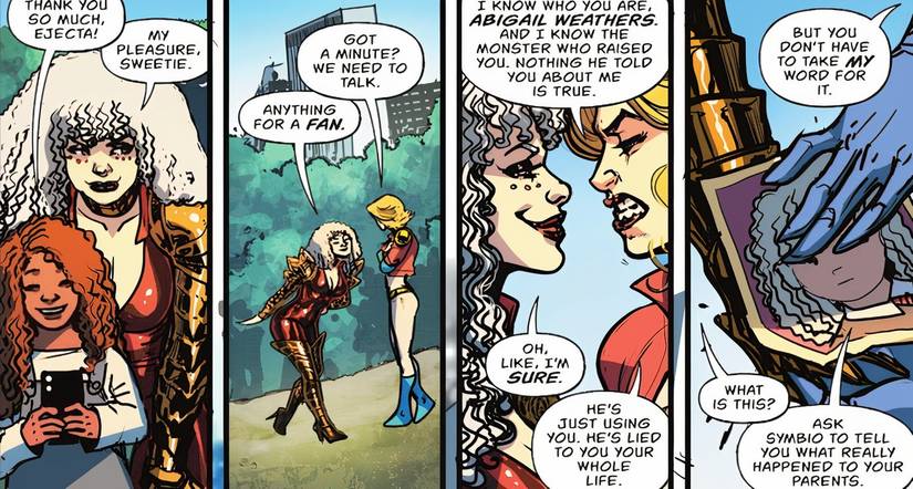 Sin familia a la que regresar ahora que sus padres están muertos, Ejecta vive con Symbio en la salvaje dimensión de bolsillo conocida como Dolira. Allá, Symbio es su padre adoptivo, entrenador y, en sus propias palabras, su “ángel” quien le salvó la vida. Desde muy joven, manipula a Ejecta, convenciéndola de que estaba huyendo de un “monstruo superfuerte” en Power Girl, que lo estaba persiguiendo “por ser diferente.” Cualquiera que haya leído los primeros números de este chica poderosa La serie sabe que hay más en la historia que eso.