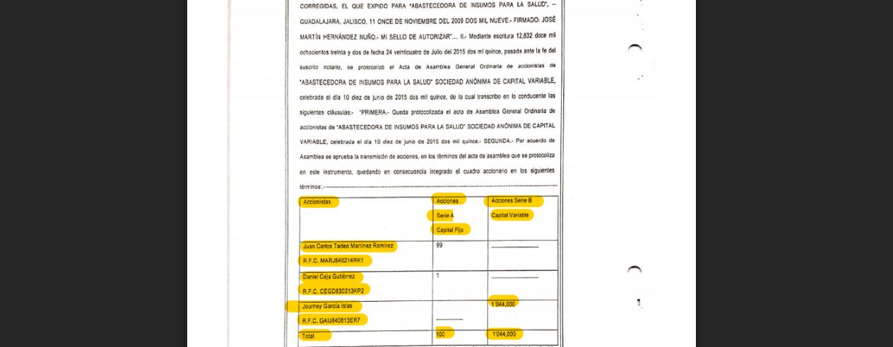 El esposo de la legisladora de Morena es Juan Carlos Tadeo Martínez Ramírez, quien actualmente es accionista de Abisalud, de acuerdo con un acta notarial obtenida por MCCI. Él, además, es representante de cuatro compañías farmacéuticas en las que sí ha reconocido participación el superdelegado, de acuerdo con registros públicos y la declaración 3de3 del funcionario.