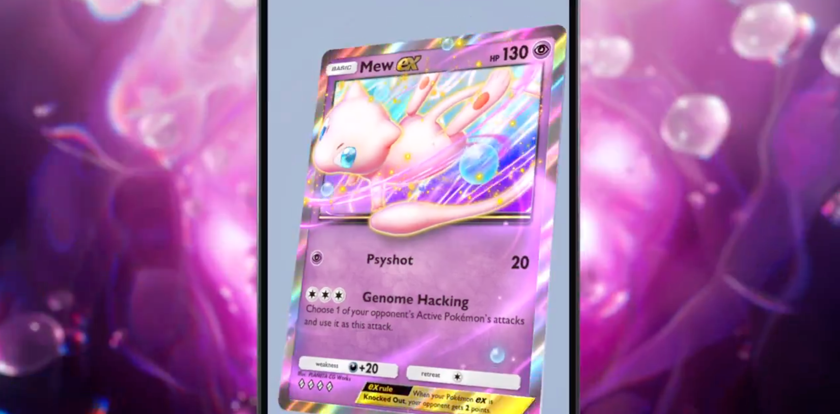 Cuando se reveló Mew ex, muchas personas notaron de inmediato lo que la tarjeta podía hacer en términos de sus capacidades de batalla. Aunque su primer ataque, Psyshot, no tiene nada de especial, su segundo ataque lo hizo destacar instantáneamente. Para tres energías de cualquier tipo, Genome Hacking le permite a Mew ex Usa cualquiera de los ataques del Pokémon Activo contrario. por sí mismo, utilizando así los propios movimientos del oponente en su contra.