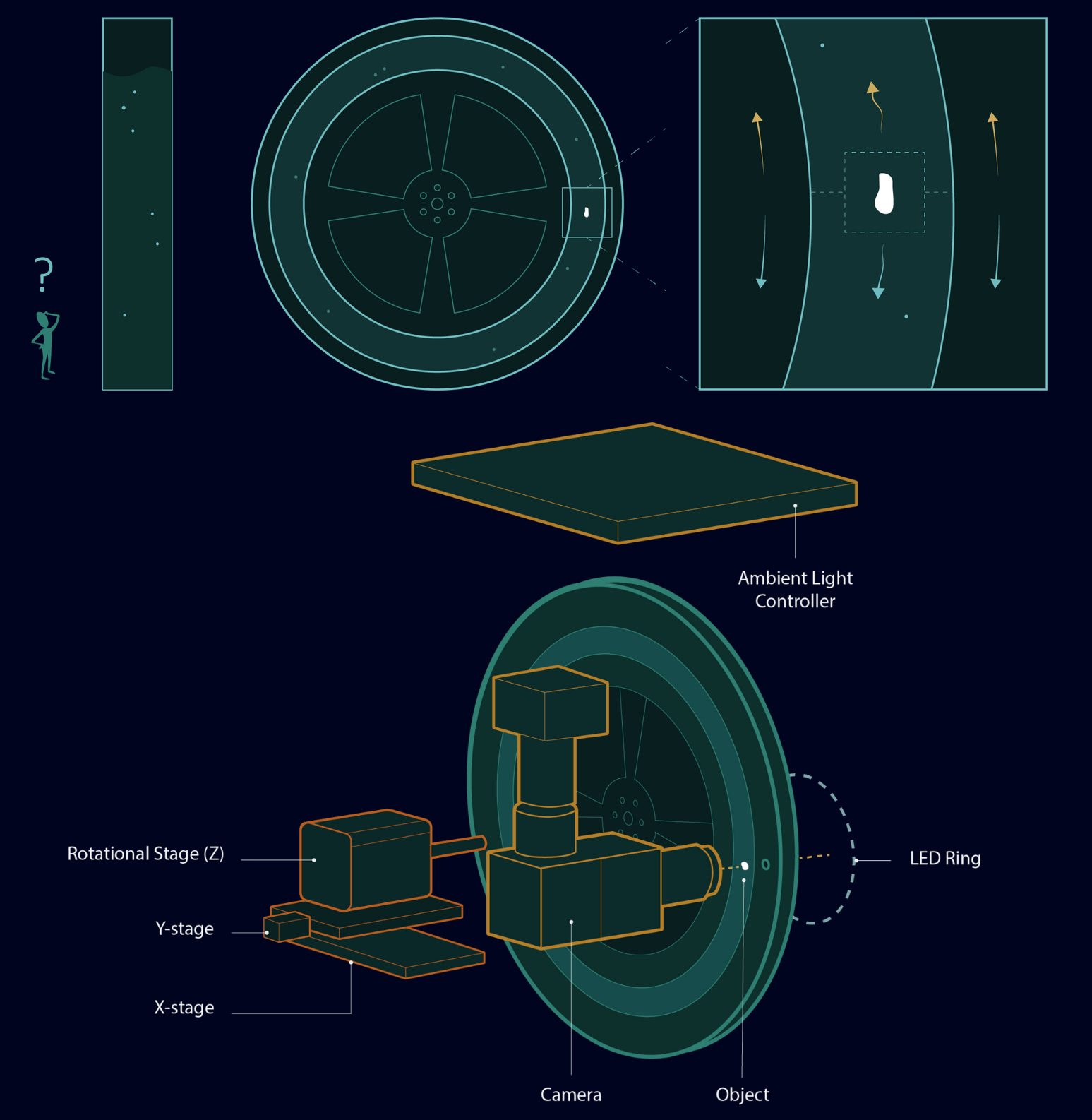El dispositivo es, en retrospectiva, casi obvio. En lugar de tener un microscopio apuntando hacia abajo a un plato donde las criaturas nadan en un charco de agua poco profundo, nada como su entorno natural, tiene uno apuntando hacia un lado a un circuito de vidrio cerrado lleno de agua y los organismos de interés. Pueden nadar libremente hacia arriba y hacia abajo y, mientras lo hacen, el bucle gira lentamente para mantenerlos dentro del marco del microscopio.