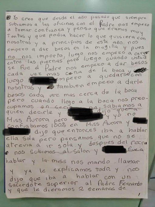 En el texto, redactado cuando tenía 10 años, relató: “El padre nos empezó a tomar confianza y pensó que éramos muy tontas y que podía hacer lo quisiera con nosotras”. También cuenta cómo Martínez empezó a besarlas y cargarlas entre las piernas. “Cuando llegó a la boca nos preocupamos en serio”.
