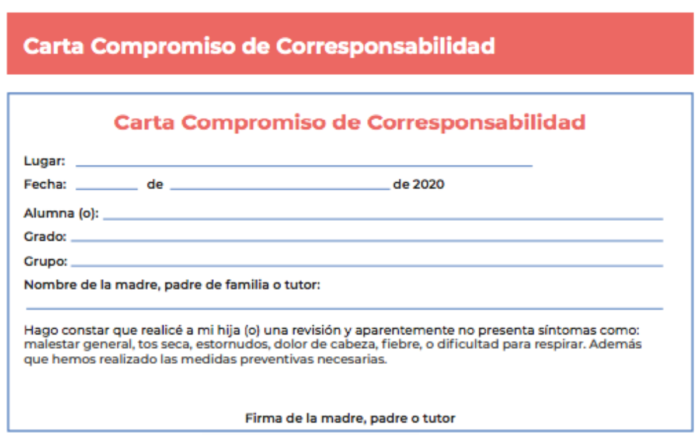 En este documento tanto las madres, padres de familia o tutores harán constar que realizó a su hija o hijo una revisión para constatar que no presenta síntomas del virus del SARS-CoV-2 como: malestar general, tos seca, estornudos, dolor de cabeza, fiebre, o dificultad para respirar. Asimismo, dejará de manifiesto que han realizado las medidas preventivas necesarias. La carta podrá realizarse a mano en cualquier tipo de papel.