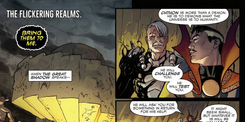 Puedo ver claramente esta historia humana en juego en el demonio Chthon. El Viejo Venom y el Doctor Strange descienden las escaleras hacia el Inframundo, realizando un rito antiguo y arquetípico. En Flickering Realms, Chthon es un dios antiguo, y ninguna magia o tecnología de estos héroes puede ayudarlos aquí en un mundo donde las leyes del mundo superior no significan nada. Mephisto tiene el infierno, que, por muy aterrador que pueda ser para un fanático de los cómics como yo, nunca podrá darme. la sensación de pavor absoluto que puede ofrecer el misterioso inframundo de Chthon.