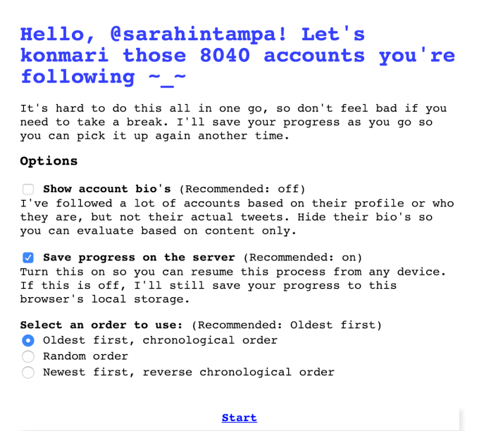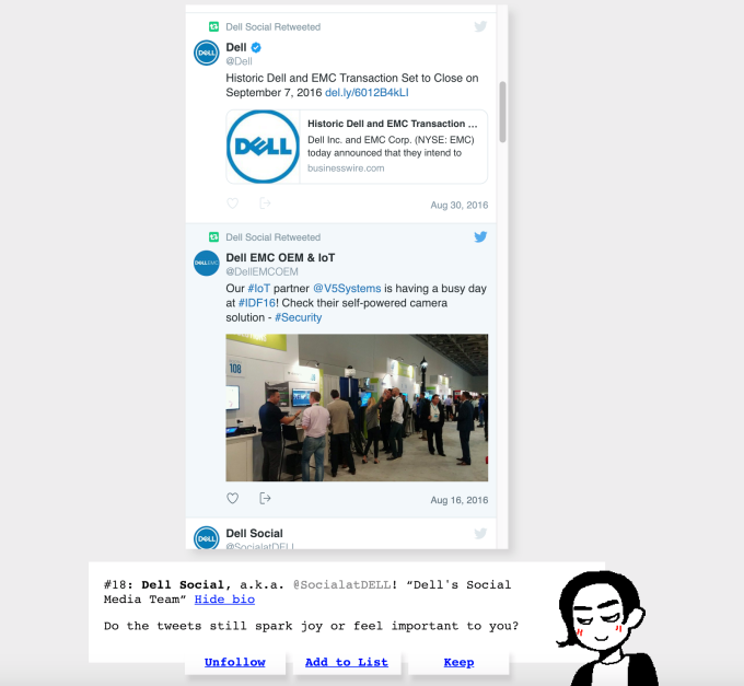 JT: Bueno, acababa de regresar a los estados después de un año en el extranjero y un año libre de Twitter. Realmente extrañaba la conexión humana, pero mi alimentación se había vuelto muy inductora de ansiedad. Vi algunos tweets de broma sobre KonMari para Twitter, y esa fue la confirmación para mí de que debería dedicar un tiempo a construirlo. En primer lugar, fue para mí, por lo que algunas de mis opiniones personales están ahí, como ocultar las biografías de las personas para que no me dejen engañar por quiénes eran, [and] Centrándose en el contenido en sí.
