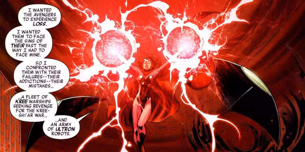Wanda usó sus poderes de deformación de la realidad para provocar que Tony Stark recayera después de años de sobriedad; enviar una flota de guerra fantasma de Kree para atacar a los Vengadores, matando a Hawkeye en el proceso; y desatar un falso Ultrón en el equipo, solo por citar algunos ejemplos de los estragos que causó en el equipo.