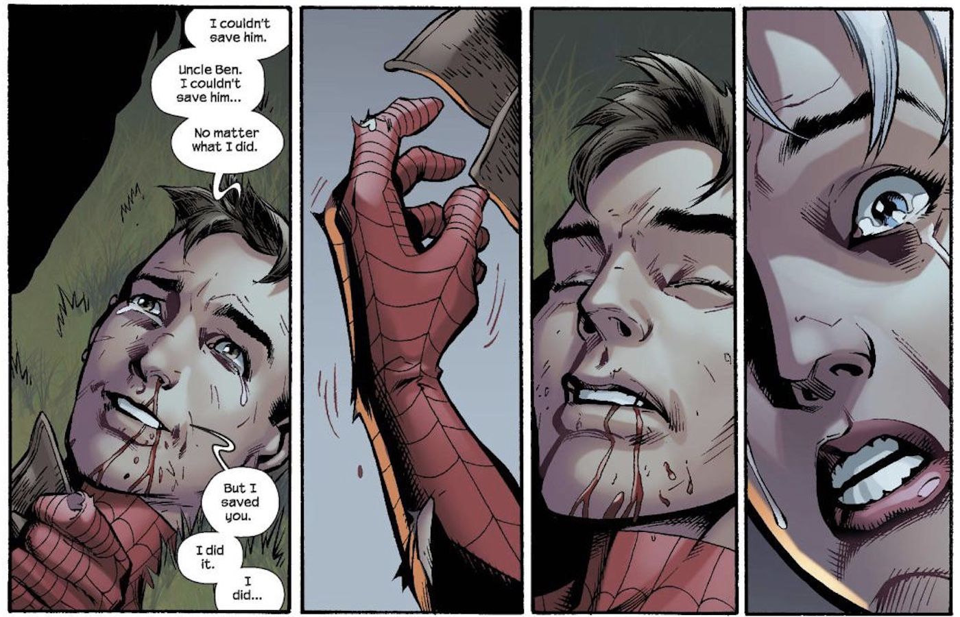 Esta es una forma absolutamente desgarradora de mostrar las emociones de Peter cuando se enfrenta cara a cara con la muerte. Si bien debería estar feliz de haberse reunido finalmente con el hombre al que accidentalmente dejó morir después de no asumir sus responsabilidades como héroe, todavía le duele saber que está dejando tanto atrás. Ya sean personas cercanas a él como la tía May y Mary Jane o la ciudad de Nueva York en general, sabe que era una decisión que debía tomar para proteger responsablemente a todos con sus poderes. Es una elección que, comprensiblemente, devoraría a Peter tras su muerte, y tiene sentido por qué las palabras del tío Ben hacen muy poco para evitar que sus emociones se muestren en el acto sutil de agarrar su abrigo.
