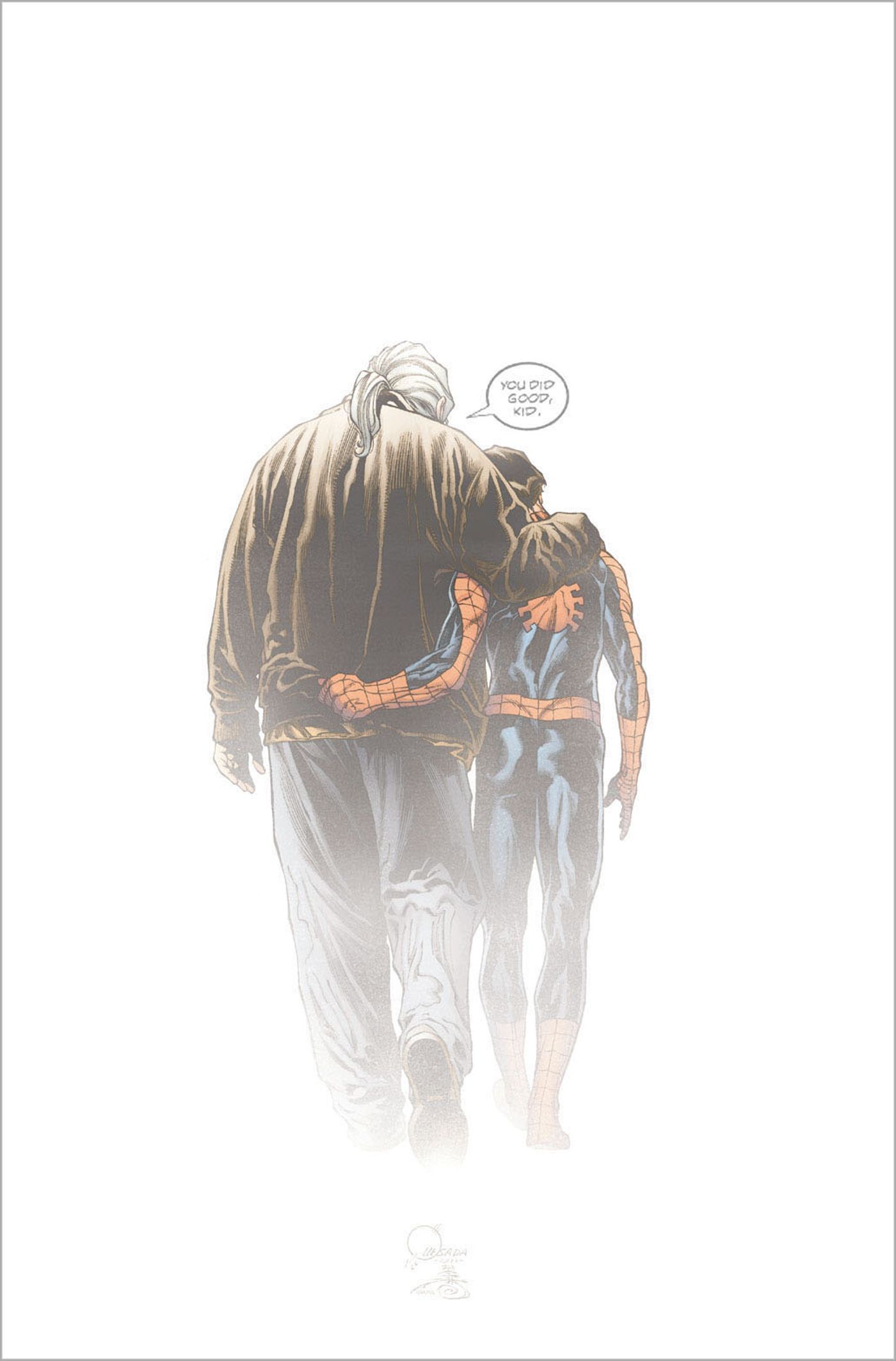 El artista Joe Quesada creó una portada memorable para El último Hombre Araña #160 que muestra a Peter reuniéndose con su tío Ben en el cielo mientras los dos se van juntos y Ben le dice: “Ylo hiciste bien, chico.” Sin embargo, resulta que hay más en la historia de lo que los fanáticos pensaban.