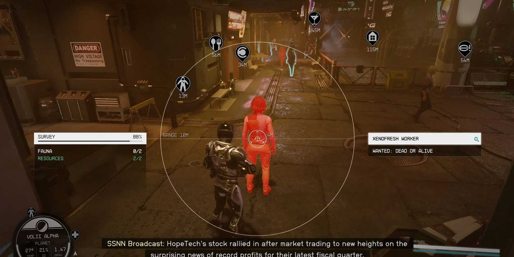 Los asentamientos principales en los Sistemas Asentados suelen estar llenos de PNJ genéricos que tienen títulos como “Ciudadano”. La mejora de recompensa de tu escáner hace que estos PNJ cumplan una función diferente a la de decorador. La mayoría de los personajes no hostiles tendrán un contorno azul a su alrededor, pero un El objetivo de la recompensa aparecerá en rojo.Un examen más detallado revelará un nombre, una lista de crímenes, una recompensa y si el objetivo es buscado muerto, vivo o cualquiera de las dos cosas.
