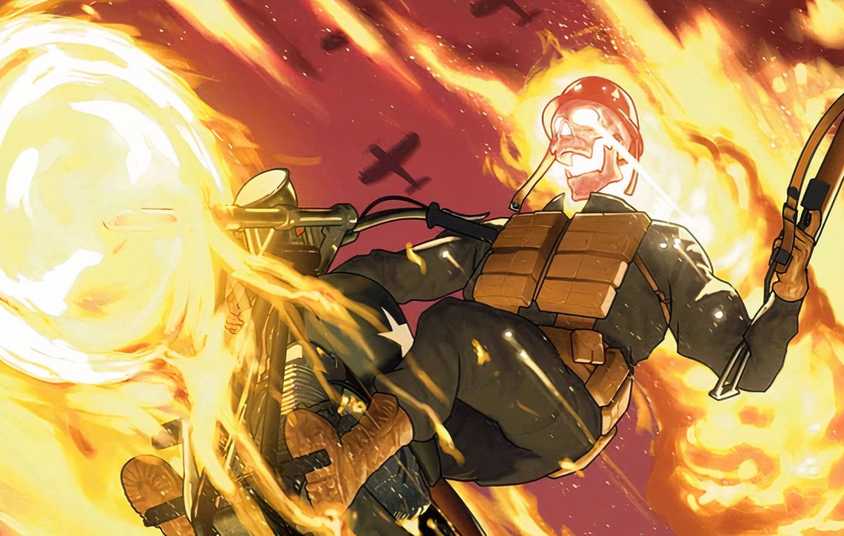 Los fanáticos lo han visto en su mota infernal y cabalgando desde el infierno y la espalda, pero en Hellhunters, Ghost Rider ’44 hace su ardiente debut en la lucha nazi.