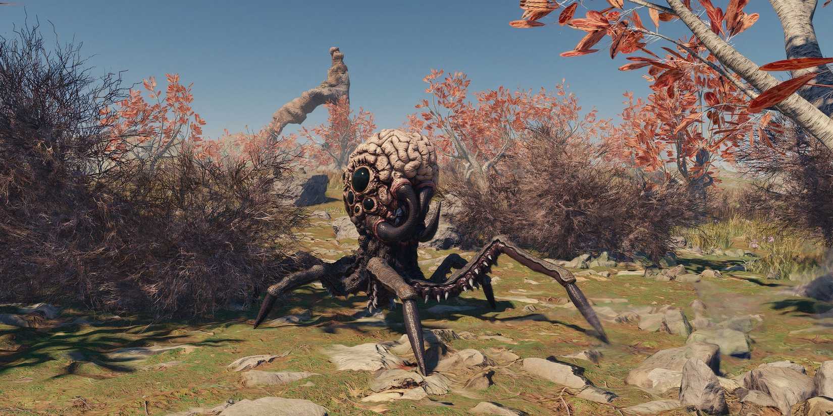 Campo de estrellas No está exento de rarezas en los sistemas colonizados. Desde el acechador Kreet, que parece un cangrejo, hasta el espeluznante Terrormorph, Campo de estrellas tiene una forma de vida alienígena de todo tipo inquietante. Hay una fauna alienígena que parece sacada directamente de las pesadillas: el calamar cerebral cazador. Con un cerebro expuesto sobre cuatro patas similares a las de un calamar, el calamar cerebral es una criatura inquietante con la que toparse. El ingenio creativo de Bethesda en el diseño de criaturas Campo de estrellas Tiene algunas referencias observables a sus otras franquicias, como El cerebro destrozado de Bud en el Polvillo radiactivo Programa de televisión.