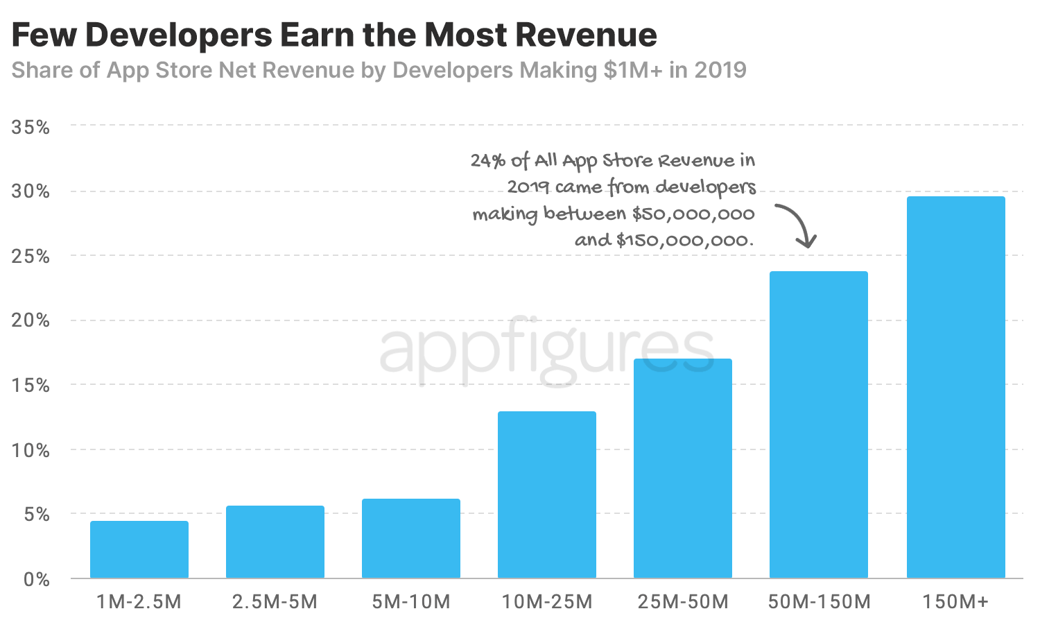El grupo más pequeño (1,5%) de desarrolladores que ganan más de $ 1 millón es el grupo que gana más de $ 150 millones. Estos representaron el 29% de los ingresos totales de la multitud de “más de $ 1 millón”. Y aquellos que ganaban entre $ 50 millones y $ 150 millones representaron el 24% de los ingresos.