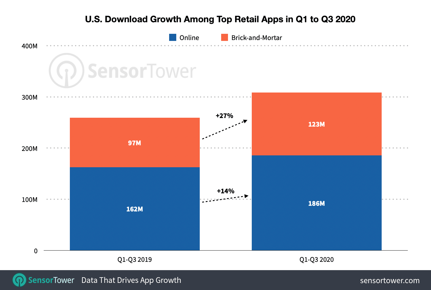 - Las aplicaciones minoristas físicas de EE. UU. Experimentaron un crecimiento del 27% en los primeros tres trimestres de 2020, o casi el doble del crecimiento de las aplicaciones de minoristas en línea (14%), medido por nuevas instalaciones. Las principales aplicaciones incluyeron Walmart, Target, Sam’s Club, Nike, Walgreens y The Home Depot.