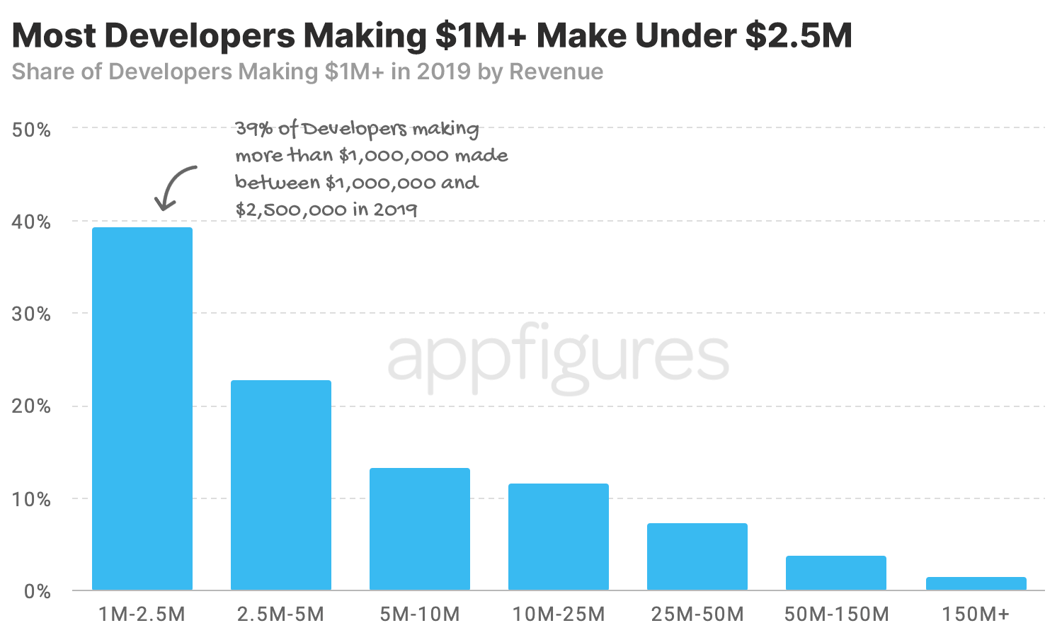 De los desarrolladores que ganan más de $ 1 millón, el mayor porcentaje (39%) ganó entre $ 1 millón y $ 2,5 millones en 2019.