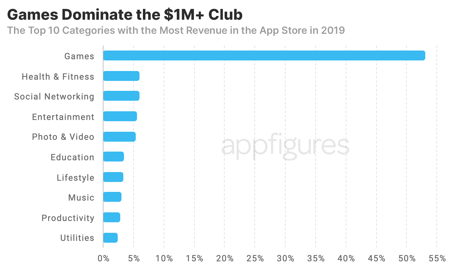 La firma también echó un vistazo a las empresas por encima de la marca de 1 millón de dólares y descubrió que alrededor del 53% eran juegos, liderados por King (de los títulos de Candy Crush). Después de una gran brecha, las siguientes categorías más grandes en 2019 fueron Salud y acondicionamiento físico, Redes sociales, Entretenimiento, luego Fotografía y video.