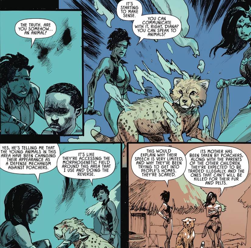 Si bien Tom King confirmó que Wonder Woman conserva su capacidad de hablar con los animales, eso no es lo mismo que verla usarla en la narrativa. Entonces, ¿cuándo fue la última vez que los fanáticos vieron a Wonder Woman comunicarse con los animales? Uno de los casos más recientes ocurrió en el ¿Tienes miedo de Darkseid? #1 Especial de Halloween en el cuento Niños de ojos negros por Terry Blas, Garry Brown y Marissa Louise. En esta historia, Diana se une a Vixen para resolver un misterio que involucra a niños extraños que aparecen en la provincia de M’Changa en Zambesi. Mujer Maravilla La capacidad de hablar con los animales juega un papel clave para ayudarlos a resolver el caso.
