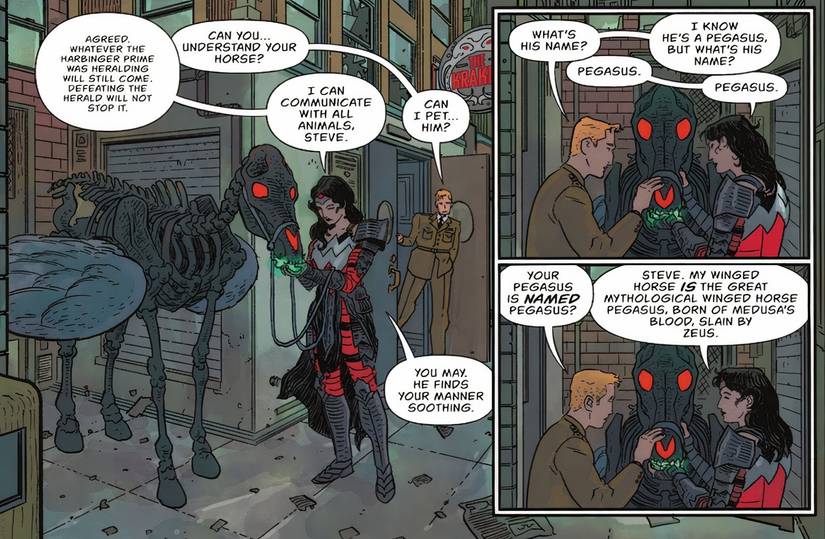 Con el regreso de Pegaso (aunque con un toque de no-muerto) en Mujer Maravilla Absoluta #1, y ahora la revelación de que Diana puede comunicarse con los animales, está claro que Thompson y Sherman están haciendo un esfuerzo muy apreciado para revivir algunos de los aspectos más matizados y subestimados de la historia de Wonder Woman. En el número 2, Steve se topa con Diana discutiendo planes de batalla con su pegaso. Sorprendido, pregunta: “¿Puedes entender… tu caballo?” A lo que Wonder Woman responde con un paciente, “Puedo comunicarme con todos los animales, Steve”. Este momento confirma que la Mujer Maravilla del Universo Absoluto comparte esta habilidad clásica con la Diana estándar.