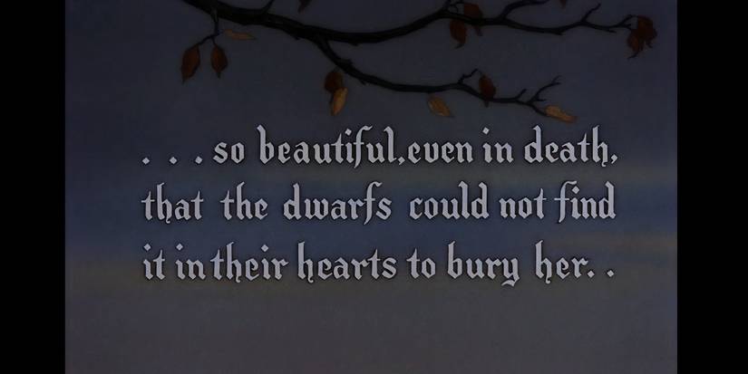 El animado Blanco como la nieve La película usa palabras escritas en tarjetas de título para contar la historia, haciendo que el texto sea tan integral a la historia como las escenas. Una tarjeta de título hacia el final inspira una teoría oscura que incluso la película de acción en vivo no consideraría. Después de que los enanos encuentran inconsciente de Blancanieves, el texto escrito dice que ella es “Tan hermosa, incluso en la muerte, que los enanos no pudieron encontrarlo en sus corazones enterrarla …“Este texto podría referirse a la maldición que se llama” Muerte dormida “, o podría revelar que Blancanieves en realidad murió al comer la manzana envenenada.