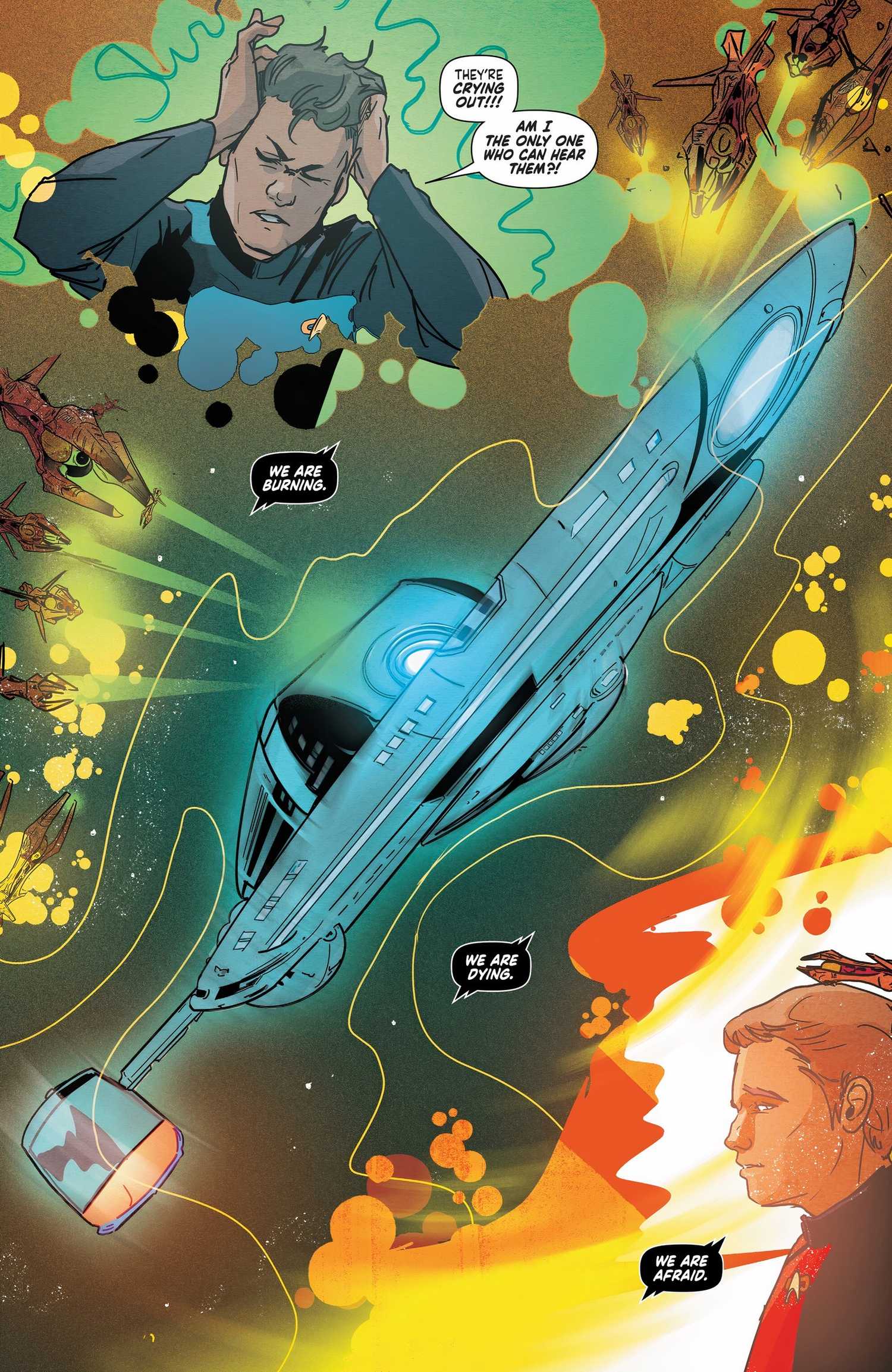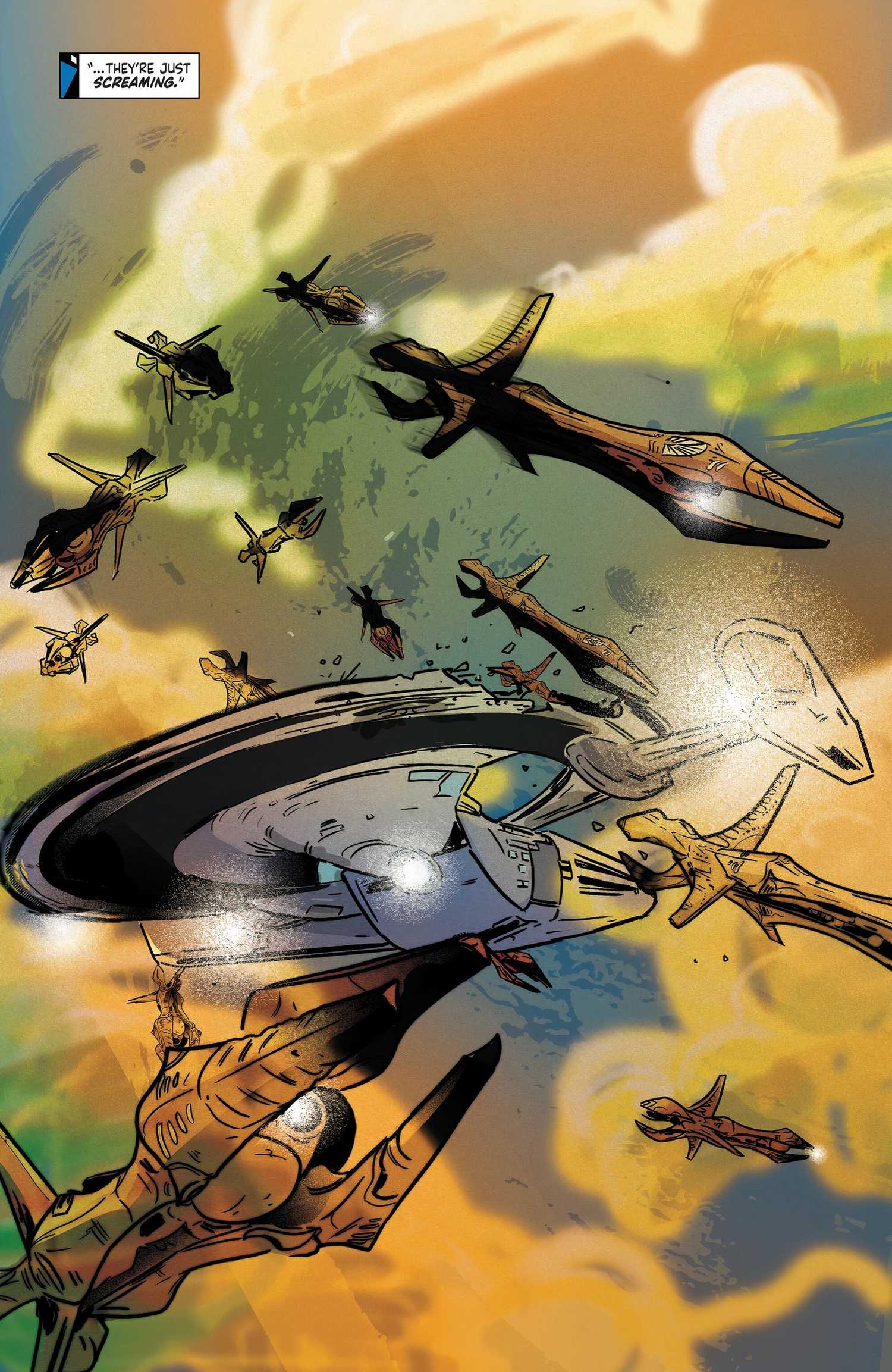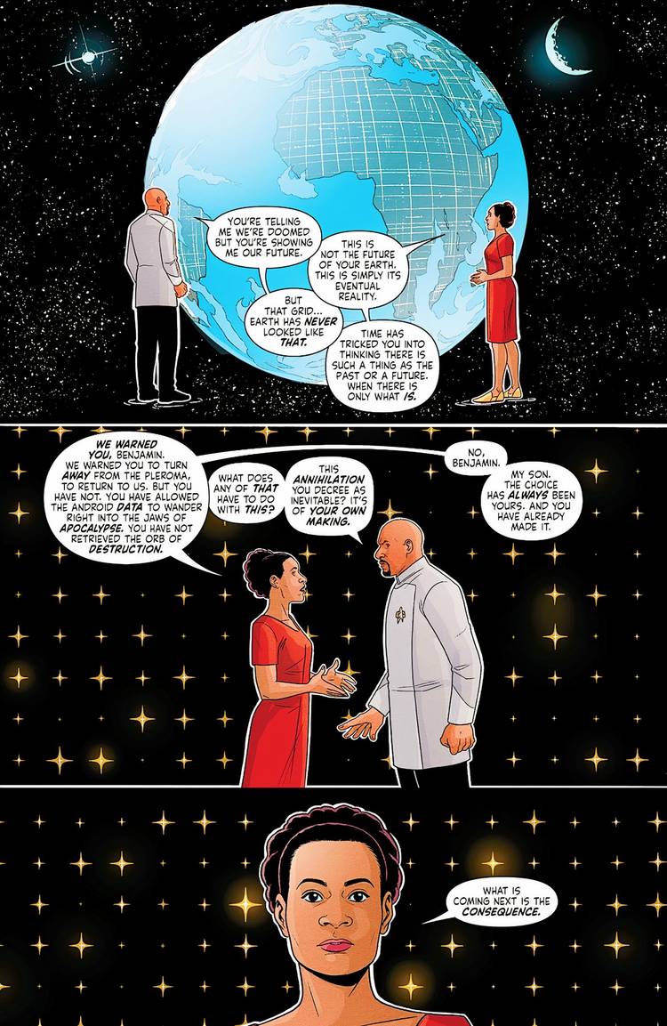 viaje a las estrellas El número 25, la primera parte de “When the Walls Fell”, está escrito por Jackson Lanzing y Collin Kelly y dibujado por Liana Kangas. A lo largo del número, Ben Sisko y el Teseo La tripulación trabaja frenéticamente para abandonar Fluidic Space antes de atraer la atención de la Especie 8472. El número incluye varios fragmentos de texto, incluido uno extra largo al final del libro, diseñado para parecerse a una sesión informativa de la Flota Estelar sobre Fluidic Space. Se detalla algunas de las especies que lo habitan, así como una teoría única sobre su origen: que es el futuro de nuestro universo.