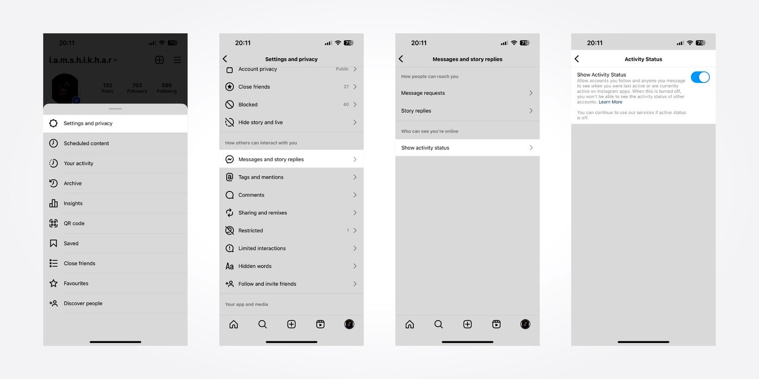 Para habilitar o deshabilitar su estado de actividad, los usuarios deben dirigirse a su perfil ‘Configuración y privacidad’ sección. En la página de inicio de Instagram, toque el menú de tres líneas en la esquina superior derecha, luego seleccione ‘Configuración y privacidad‘ en la parte superior del menú. Desplácese hacia abajo y debajo de ‘Cómo otros pueden interactuar contigo‘sección, pulsa’Mensajes y respuestas a historias.‘Finalmente, seleccione’Mostrar estado de actividad‘ y active o desactive la función según los requisitos usando el interruptor en la siguiente pantalla. Instagram menciona que los usuarios pueden continuar usando los servicios de la aplicación incluso si desactivan la función.