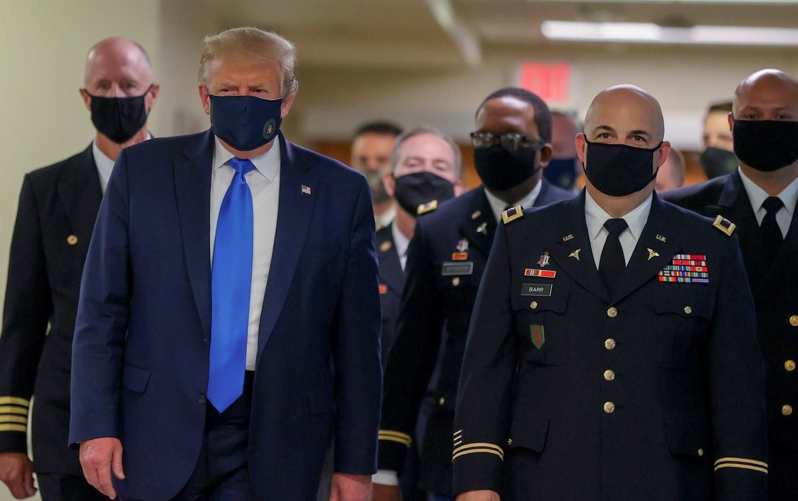 Trump usó una mascarilla negra mientras caminaba por los pasillos del hospital militar Walter Reed, en las afueras de Washington, para reunirse con veteranos heridos, según las imágenes de CNN.