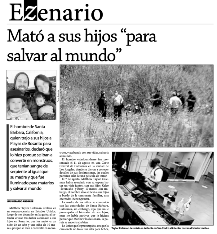 “Coleman declaró que creía que sus hijos iban a convertirse en unos monstruos así que tenía que matarlos. Dijo que primero mató –a la niña- disparándole con un arpón de pesca, luego al niño, quien no se murió en el primer ataque, por lo que movió el arpón –bruscamente-, y el hombre se cortó la mano.