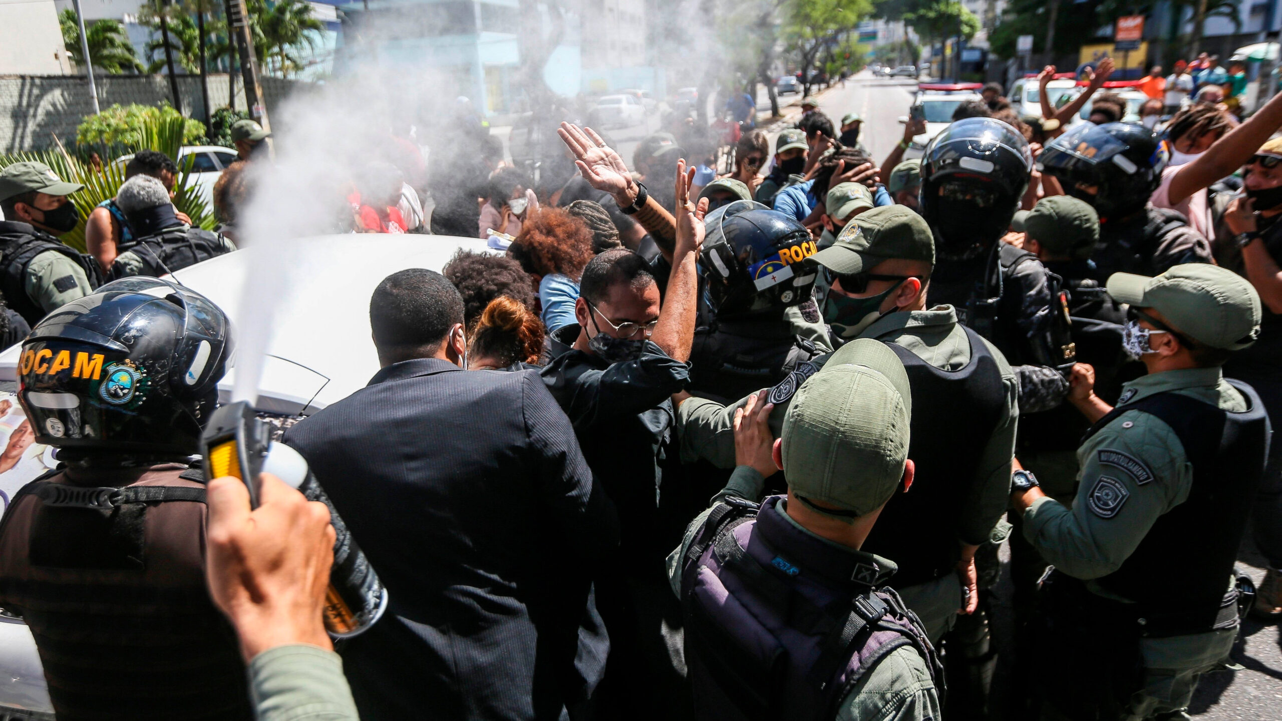 Los manifestantes pintaron la fachada del local y de algunas patrullas de la Policía con mensajes alusivos a la muerte de Silveira Freitas, conocido como Beto, intentando después entrar al establecimiento, lo que condujo a la intervención policial con gases lacrimógenos y a la detención de una activista.