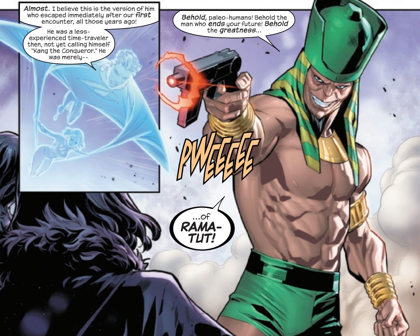 Los cuatro fantásticos (2022) #17 (escrito por Ryan North, ilustrado por Carlos Gómez, coloreado por Jesús Aburtov y escrito por Joe Caramagna de VC) establece que la versión más peligrosa de Kang es Rama-Tut, porque no se preocupa por la línea de tiempo. Después de descubrir lo que parece ser el esqueleto fosilizado de Sue Storm, Sue y Reed Richards viajan al pasado y descubren que Rama-Tut está intentando asesinar a los primeros humanos que pisaron Estados Unidos.