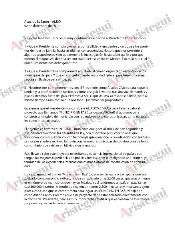 En el texto, que fue leído por Adrián LeBarón a López Obrador, las familias también demandaron al Presidente que “se comprometa a quitarle al crimen organizado el control de los municipios del país. Y que en concreto mande seguridad federal para tener una zona segura en Bavispe para empezar.”