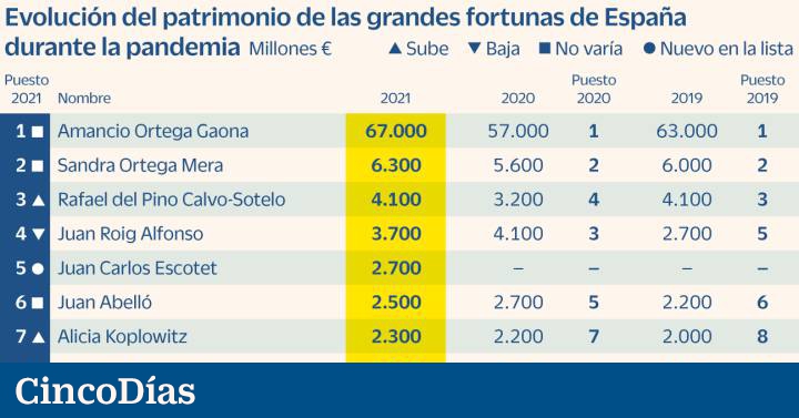 El segundo puesto de la citada clasificación lo ocupa, como en ediciones anteriores, pero a gran distancia en cuanto a la cuantía, su hija Sandra Ortega, que acumula una fortuna de 6.300 millones, 700 más que el año pasado, en el que perdió, debido a la pandemia, 400 millones de euros. El podio lo completa Rafael del Pino, que recupera el patrimonio de 4.100 millones de euros que tenía en 2019, tras perder el año pasado 900 millones. El presidente de Ferrovial vuelve al mismo puesto de hace dos años, el que le arrebató el pasado ejercicio Juan Roig, que ocupa ahora la cuarta posición. El presidente de Mercadona, con una riqueza de 3.700 millones, fue uno de los grandes beneficiados por la crisis sanitaria: en 2020 incrementó su fortuna en 1.400 millones, pasando de los 2.700 a 4.100 millones.