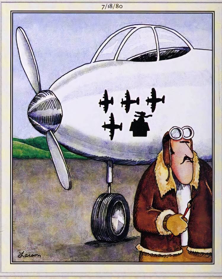 Los lectores conocedores de la historia sabrán que el combate aéreo se puso de moda a principios del siglo XX, durante la Primera Guerra Mundial. En esa época, surgió la tradición de que los pilotos llevaran un registro de sus derribos pintando una silueta de un avión enemigo en el costado de su caza, algo que Gary Larson satirizó ingeniosamente en repetidas ocasiones.