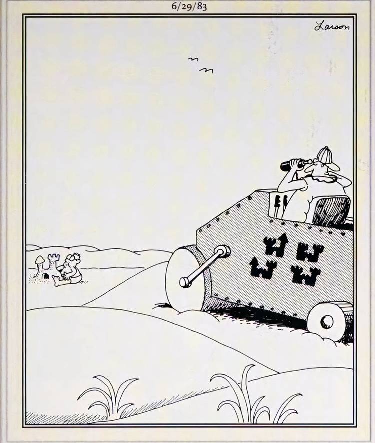 Publicado un año y medio después de la última iteración del chiste, el tercer “marcador de muerte” Lado lejano Esta caricatura es sin duda la más extraña, lo que hace que la abreviatura visual del chiste sea aún más vital. En esta historieta, un hombre se sienta en Un tanque con cuatro siluetas de castillos en el costado, usando binoculares para observar el próximo castillo de arena que va a atropellar.que actualmente está siendo construido por un niño. Es un ejemplo máximo del tipo de rareza patentada que hizo El lado lejano destacar.