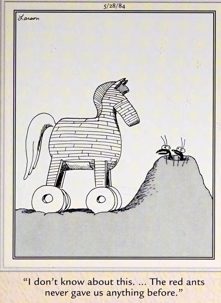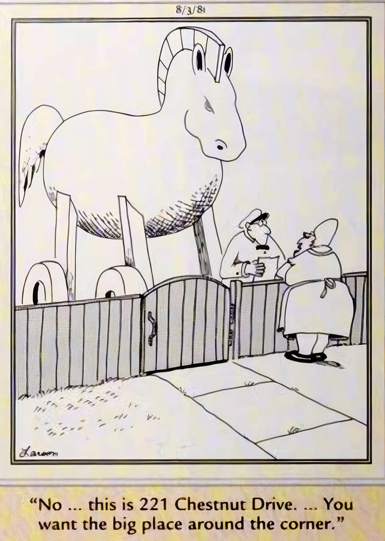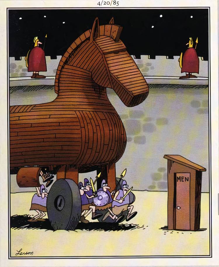 La caricatura del Caballo de Troya del 20 de abril de 1985 sirve básicamente como secuela de la primera representación del Caballo que Gary Larson hizo del 16 de marzo de 1981. En el panel anterior, un soldado en el vientre del Caballo de Troya amonesta a su camarada por no ir al baño antes de meterse en el Caballo. En el panel siguiente, se representa una horda de soldados detrás de los muros de Troya, emergiendo de la parte inferior del Caballo y corriendo hacia una letrina.