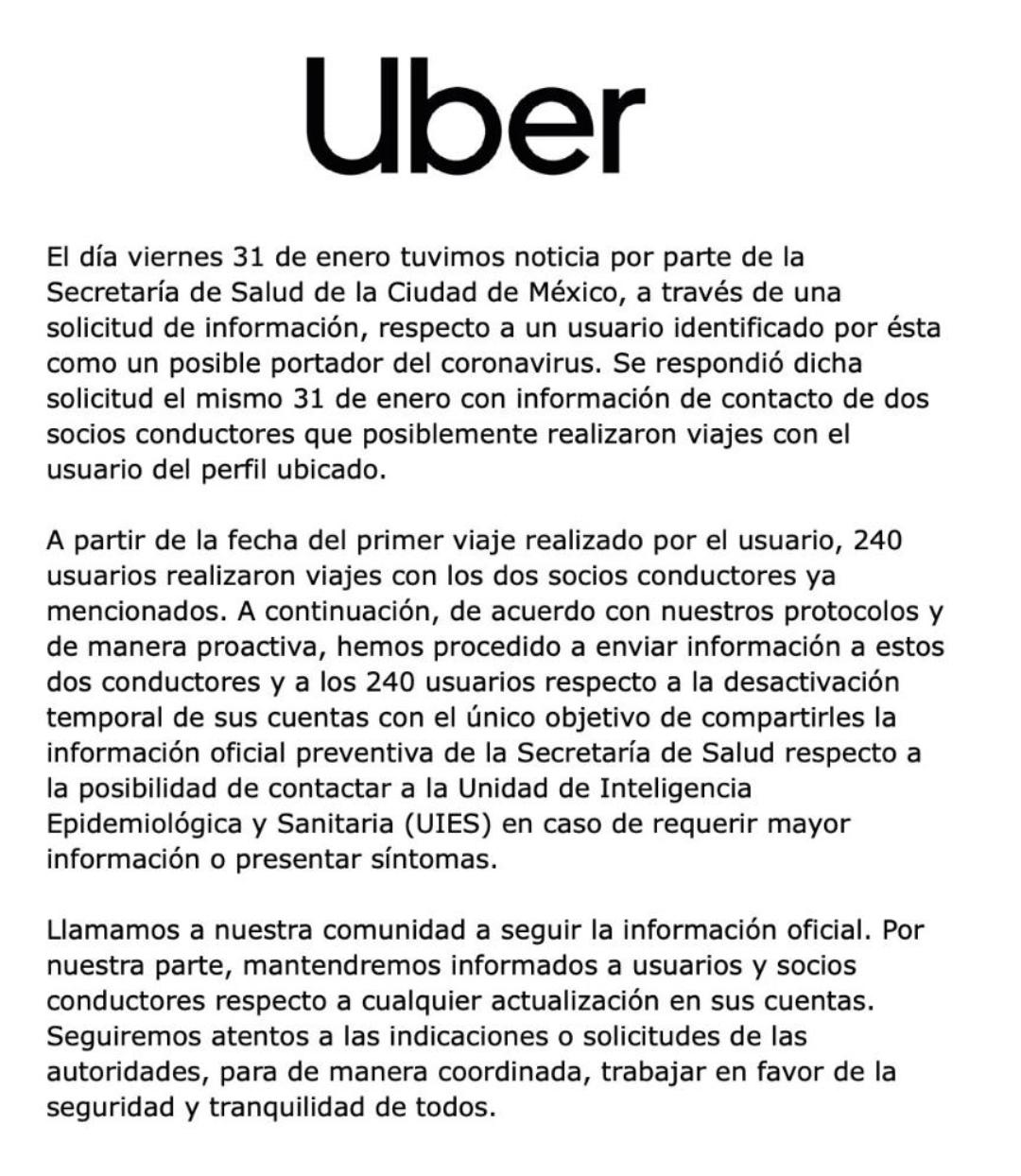 “A partir de la fecha del primer viaje realizado por el usuario, 240 usuarios realizaron viajes con los dos socios conductores ya mencionados. A continuación, de acuerdo con nuestros protocolos y de manera provocativa, hemos procedido a enviar información a estos dos conductores y a los 240 usuarios respecto a la desactivación temporal de sus cuentas con el único objetivo de compartirles la información oficial preventiva de la Secretaría de Salud respecto a la posibilidad de contactar a la Unidad de Inteligencia Epidemiológica y Sanitaria (UIES) en caso de requerir mayor información o presentar síntomas”, expuso Uber.