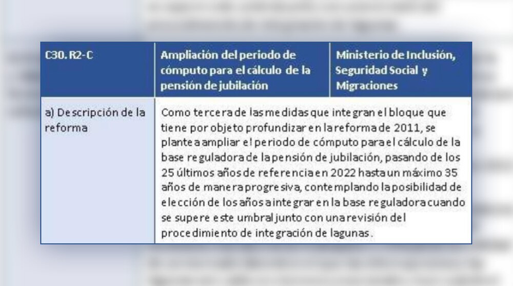 La descripción de la ficha incluida en el documento enviado a los ministros económicos, con la propuesta que Escrivá ha dicho este miércoles que “no ha existido”, dice así: “Como tercera de las medidas que integran el bloque que tiene por objeto profundizar en la reforma de 2011, se plantea ampliar el periodo de cómputo para el cálculo de la base reguladora de la pensión de jubilación, pasando de los 25 últimos años de referencia en 2022 hasta un máximo 35 años de manera progresiva, contemplando la posibilidad de elección de los años a integrar en la base reguladora cuando se supere este umbral junto con una revisión del procedimiento de integración de lagunas”.