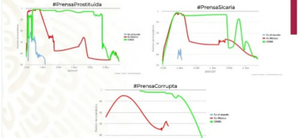 Este lunes, la Unidad de Información, Infraestructura, Informática y Vinculación Tecnológica de la Secretaría de Seguridad y Protección Ciudadana (SSPC) presentó un análisis de los mensajes que se hicieron en redes sociales con los hashtags #PrensaProstituida PrensaSicaria #PrensaCorrupta, luego de la confrontación que tuvo el presidente Andrés Manuel López Obrador con los periodistas durante la mañanera del 31 de octubre.