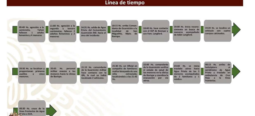 El general Homero Mendoza Ruiz, jefe del Estado Mayor de la Defensa Nacional, dio a conocer este miércoles la línea del tiempo de la emboscada que sufrieron las familias LeBarón y Langford en los límites de los estados de Sonora y Chihuahua el pasado 4 de noviembre.
