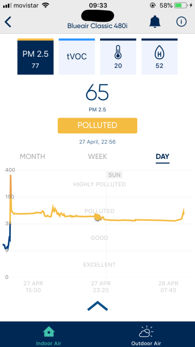 Además de eso, en el modelo que estoy probando, Blueair tiene sensores integrados de calidad del aire, que se conectan a través de wi-fi a la aplicación complementaria donde el usuario curioso puede ver diagramas en tiempo real de cosas como PM 2.5 y niveles de tVOC, y Comience a unir los puntos entre lo que está sucediendo en su hogar y lo que la máquina está olfateando.