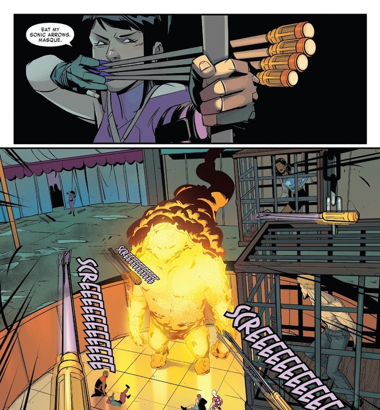 Este es un cambio marcado con respecto a los días en que Kate lideraba sola a los Vengadores de la Costa Oeste, y tiene la oportunidad de mostrar sus habilidades como parte de un equipo más experimentado. Con el destino del mundo en juego, Kate asciende a las grandes ligas y se une a Cap, Quicksilver, Hercules y Hazmat para una ronda de caza de monstruos.