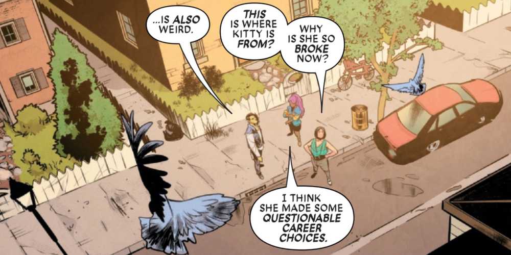 En Excepcionales X-Men #12, de Eve L. Ewing y Federica Mancin, los estudiantes de Kitty Pryde regresan en el tiempo y ven que el vecindario Kitty Pryde creció, lo que les hace preguntarse por qué Kitty Pryde está tan bajo su suerte ahora.