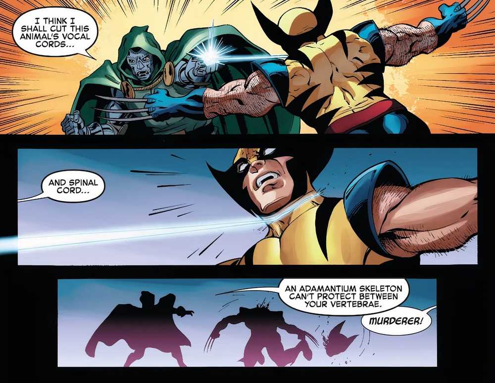 En A+X #17, el doctor Doom y Wolverine se enfrentan cara a cara, y la pelea dura todo lo que los fanáticos esperarían. Utilizando su dominio de la tecnología y el misticismo, el doctor Doom detiene a Wolverine en seco mientras Logan lo estaba cargando cortando las vértebras del X-Man entre su columna vertebral recubierta de adamantium.